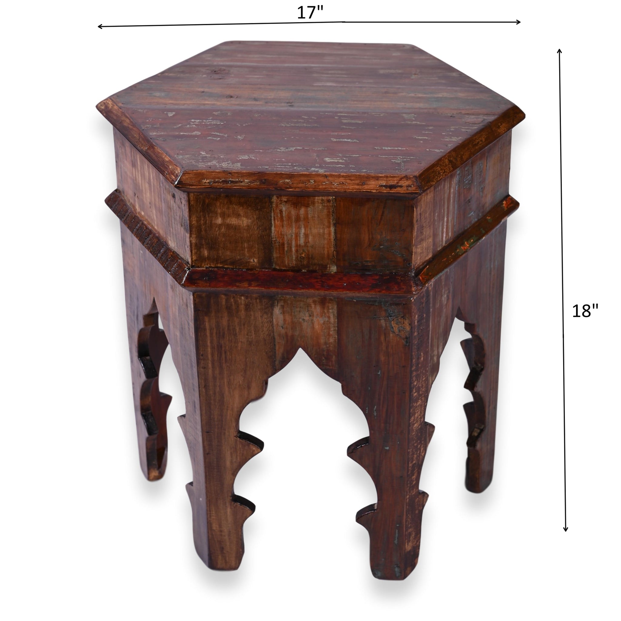 This distinctive hexagonal reclaimed solid wood 17-inch accent table will add an eye-catching style to your living room or den. It is a perfect piece for your home or café. Display a bouquet, stylish lamp, sculptural décor, or place it by your favorite chaise. Simply use it as a stool and this primitive style reclaimed stool will bring you seating comfort while delivering high sturdiness. 100% Handcrafted from recycled wood and hand-finished with the Rustic effect. Each panel of salvaged wood showcases its life's story through a beautiful array of colors, natural grains, and markings